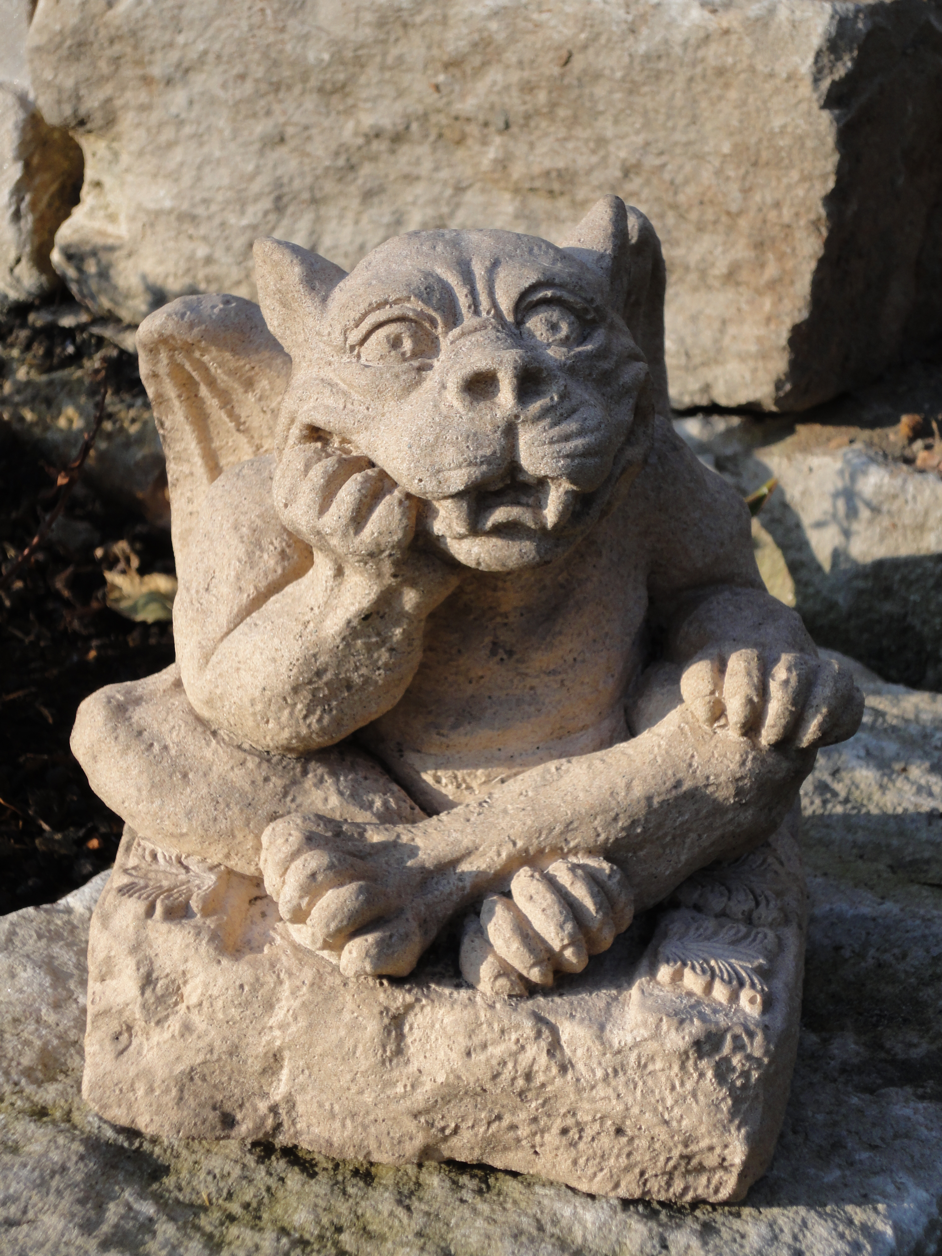 Als ich heute nach getaner Arbeit auf unserer Gartenbank saß und den Sonnenschein genoss, fiel mein Blick auf den Dämonenpoeten auf unserer Terrassenmauer, der in die Betrachtung der Krokusse versunken war. Dabei waren ihm folgende Zeilen in den Sinn gekommen, die er mich bat, in mein Notebook zu tippen. Sie enthalten einen guten Rat, den ich öfter beherzigen sollte! 😀