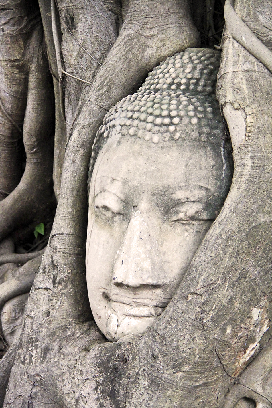 Ayutthaya war vierhundert Jahre lang Hauptstadt von Siam, bis sie 1767 von den Burmesen zerstört wurde. Eindrucksvolle Ruinen zeugen noch heute von der ehemaligen Pracht der Anlagen. Besonders beliebt als Fotomotiv ist ein von Luftwurzeln umklammerter, steinerner Buddhakopf. Glücklicherweise besichtigen wir die Ruinen, bevor wir ins Hotel fahren, weil ein Gewitter angesagt ist. Unser Karma ist gut genug: wir schaffen alle wichtigen Punkte vor dem Regen, sehen sogar noche einige Elefanten und erreichen mit den ersten Tropfen den Bus. Jetzt kann es von mir aus die ganze Nacht regnen, solange morgen wieder schönes Wetter ist.