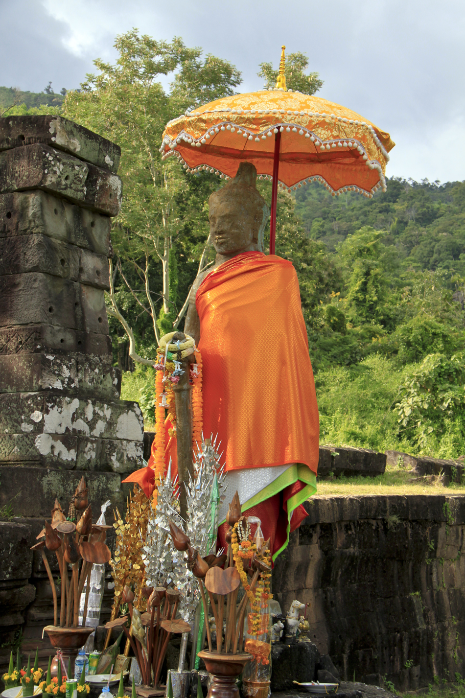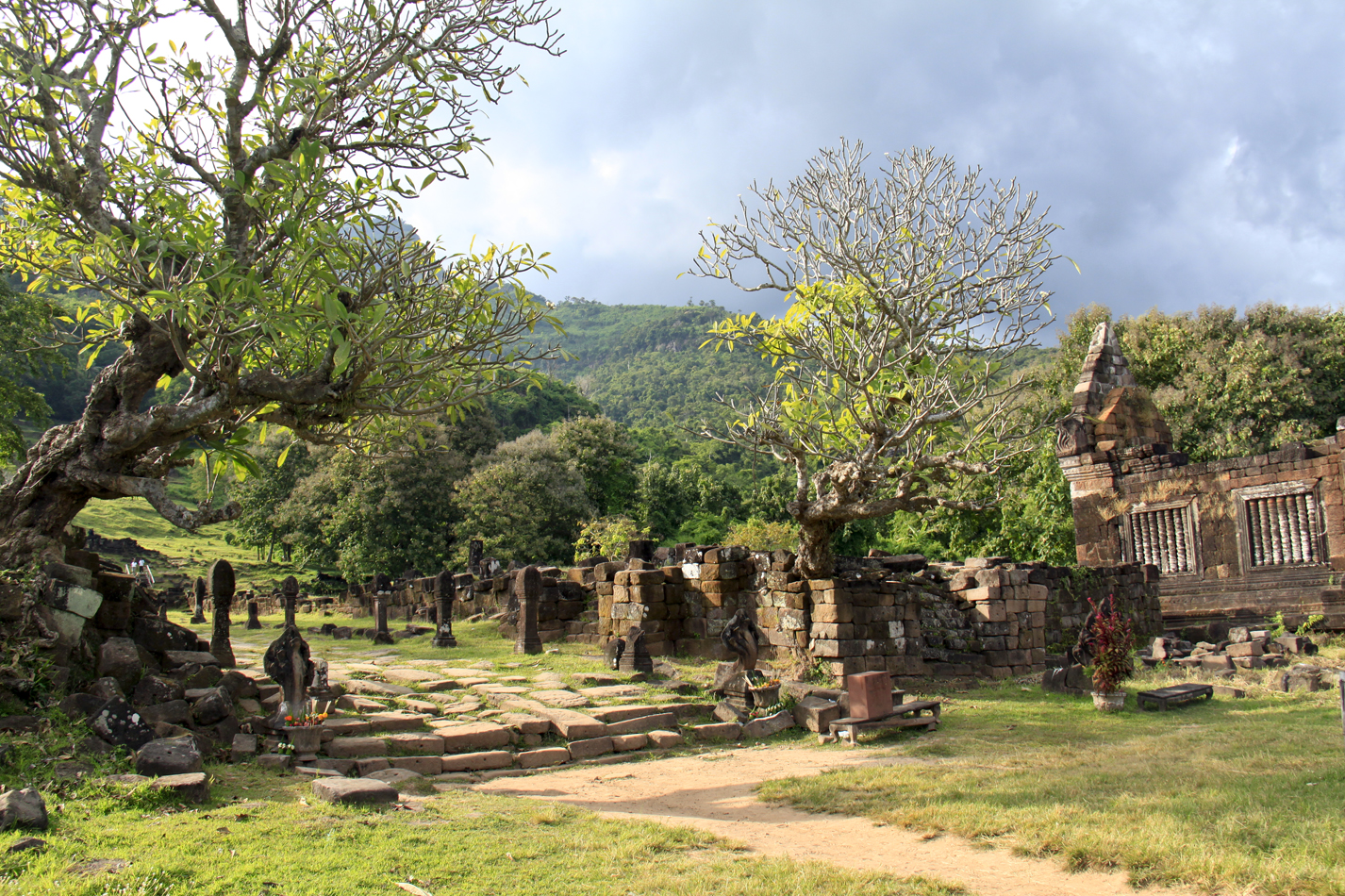 So, kein Tag ohne Tempel, schließlich ist dies hier eine Studienreise und überhaupt streben wir nach Erleuchtung und müssen daher unser Karma verbessern. Nach einem schweißtreibenden Aufstieg bei über 30 Grad Celsius über unzählige hohe und schmale, ausgetretene Stufen erreichen wir den Bergtempel Wat Phou. Ohne Schweiß kein Preis keine Erlösung. Immerhin ein sehr stimmungsvoller Ort mit einer fantastischen Aussicht auf die untere Anlage mit den Wasserbecken, die in diesem Fall eher Teichen ähneln.