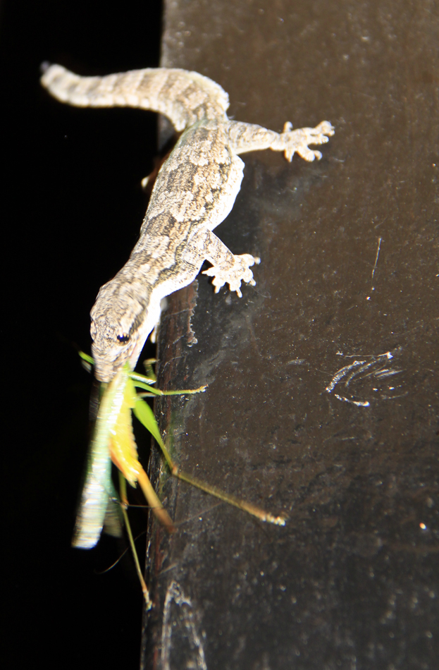 Am Abend faulenzen wir auf dem Schiff und lassen den Abend gemütlich ausklingen. Inzwischen sind wir fast alle auf das ‚du‘ umgestiegen und haben jede Menge Spaß. Unser Reiseleiter erzählt uns noch ein Märchen über die Entstehung der Mücken und zwei Geschichten von Shiva und Parvati (irgendwie kommen die Frauen in all diesen Geschichten nicht besonders gut weg). Außerdem lerne ich den Schiffsgecko kennen, der in der Lampe über dem Liegestuhl wohnt, in dem ich es mir gemütlich gemacht habe, und mir die Mücken vom Leibe hält. Fasziniert beobachten wir, wie er einen Grashüpfer schnappt und verspeist, der halb so groß ist wie er. Natürlich ist ausgerechnet im Moment des Triumphs der Akku leer, aber ein Beweisfoto gelingt mir doch. Als ich später ins Bett gehe, sage ich auch dem Gecko gute Nacht, der nach wie vor in seinem Lampenschirm hockt und mich mit seinen Knopfaugen anschaut.