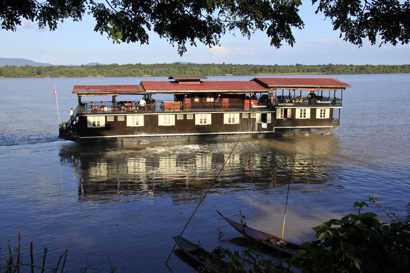 Nach dem Lao Style Latte im Café Sinouk fahren wir zwei Stunden mit Langbooten zu unserem ‚Kreuzfahrtschiff‘, das nach dem Tempel benannt ist, den wir am Nachmittag besichtigen. Das Ufer ist grün und wenig besiedelt. Rechts von uns ragen einige Berge von der Höhe eines Mittelgebirges auf. Die Wat Phou ist ein kleines Schiff mit nur 12 Kabinen. Das heißt, außer unserer Gruppe ist niemand an Bord und wir können uns nach Belieben ausbreiten. Zum Mittag gibt es Dumplings, Frühlingsrollen und vietnamesische Gemüserollen. Alles schmeckt sehr gut und ist mehr als reichlich. Meine Kabine ist klein, aber fein. Trotzdem bin ich froh, dass ich sie mit niemandem teilen muss. Zu zweit wäre es doch ganz schön eng. Jetzt noch ein bisschen an Deck erholt bzw. meditiert, denn wie sagte unser Reiseleiter so schön? Lieber meditieren als rumsitzen und nichts tun. J Immerhin beherrsche ich den Lotussitz.