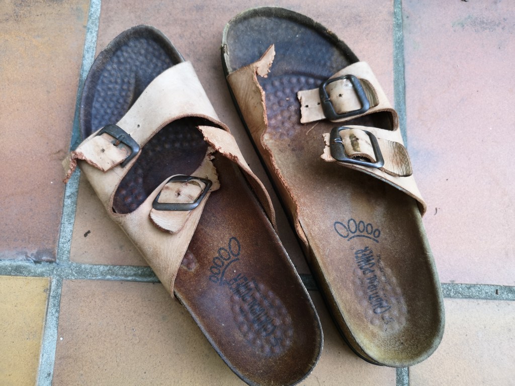 An die Schuhe habe ich gar nicht mehr gedacht. Am späten Abend liegen meine Latschen auf dem Rasen – mit zerkauten Riemen. War noch echtes Leder, das war wohl lecker. Von meinen Schnürschuhen fehlt der eine ganz, ich finde ihn im Dunkeln auch nicht wieder, erst am nächsten Tag hinten im Garten – immerhin nicht zerkaut. Also habe ich ein neues Paar Pantoletten bestellt, im Sonderangebot (leider kein Leder mehr). Als ich heute bei der Arbeit die Mail bekomme, dass meine Schuhe geliefert werden, denke ich nur: „Oh, oh, hoffentlich stellt der Paketdienst das Paket nicht auf der Terrasse ab. Dann kommt der Fuchs, zerfetzt die Verpackung, denkt: ‚Geil, neue Schuhe!‘ und zerkaut die auch wieder.“ Zum Glück hat der Paketdienst mitgedacht und die Lieferung hinter Tisch und Stuhl an der Wand verkeilt. Vielleicht haben sie den Fuchs ja gesehen, der schleicht selbst tagsüber durch den Garten. Gestern war er auch da, ich habe ihn durchs Küchenfenster angeschaut und er mich auch, und was soll ich euch sagen? Er hat so ausgesehen, als wüsste er ganz genau, dass es nicht in Ordnung war, meine Schuhe zu zerkauen. Ich habe sie ihm überlassen, sind ja eh kaputt. Aber wahrscheinlich will er sie jetzt nicht mehr. Die neuen stehen jedenfalls drinnen.