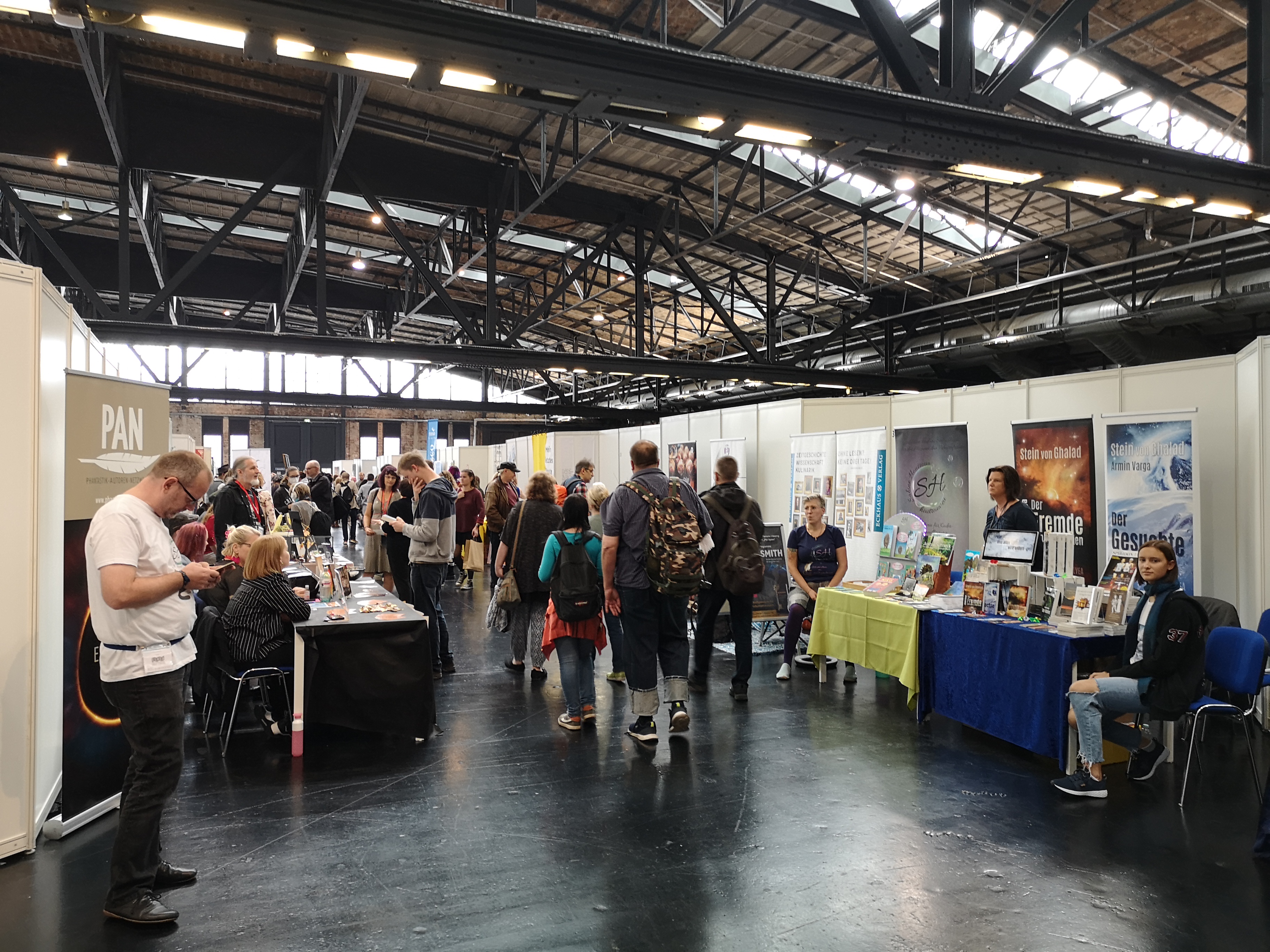 Die Buch Berlin vom November auf den 17. und 18. September vorzuverlegen, war nicht nur wegen Corona eine gute Idee. Auch wenn das Wetter derzeit nicht eben entzückt, ist es wärmer als im November und allemal länger hell. Auch die breiten Gänge waren angenehm. Die Besucher*innen konnten an den Ständen zu beiden Seiten stehenbleiben, ohne dass es Gedränge gab.