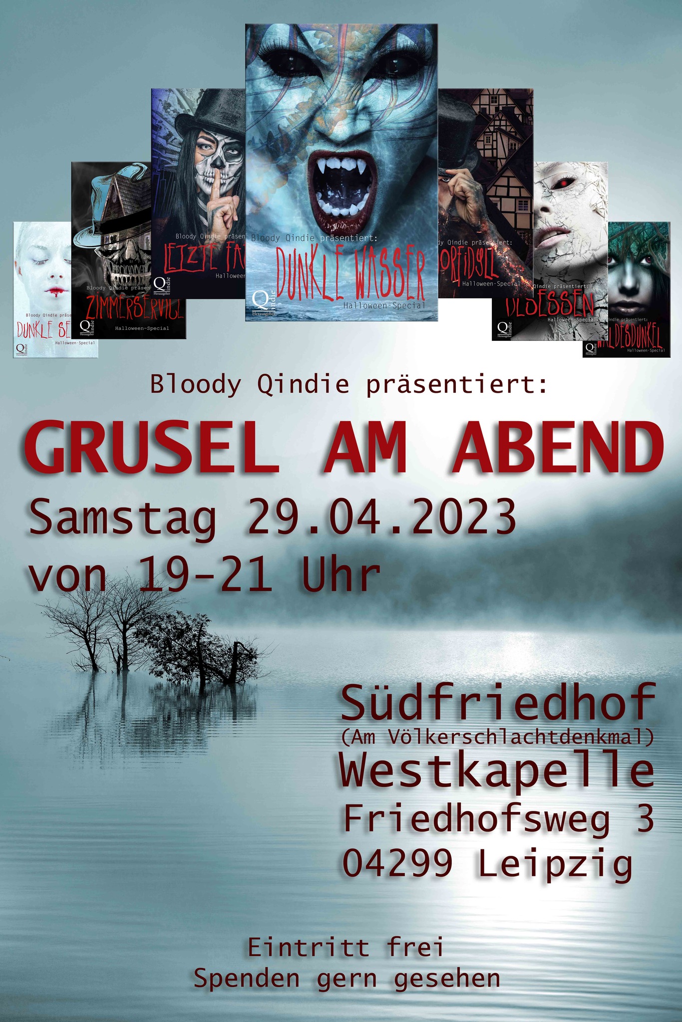 29. April 2023, 19 Uhr, Leipzig: Bloody Qindie präsentiert: Grusel am Abend, Gemeinschaftslesung aus Qindies dunklen Anthologien, Westkapelle auf dem Südfriedhof, Friedhofsweg 3, 04299 Leipzig (im Rahmen der Leipziger Buchmesse)